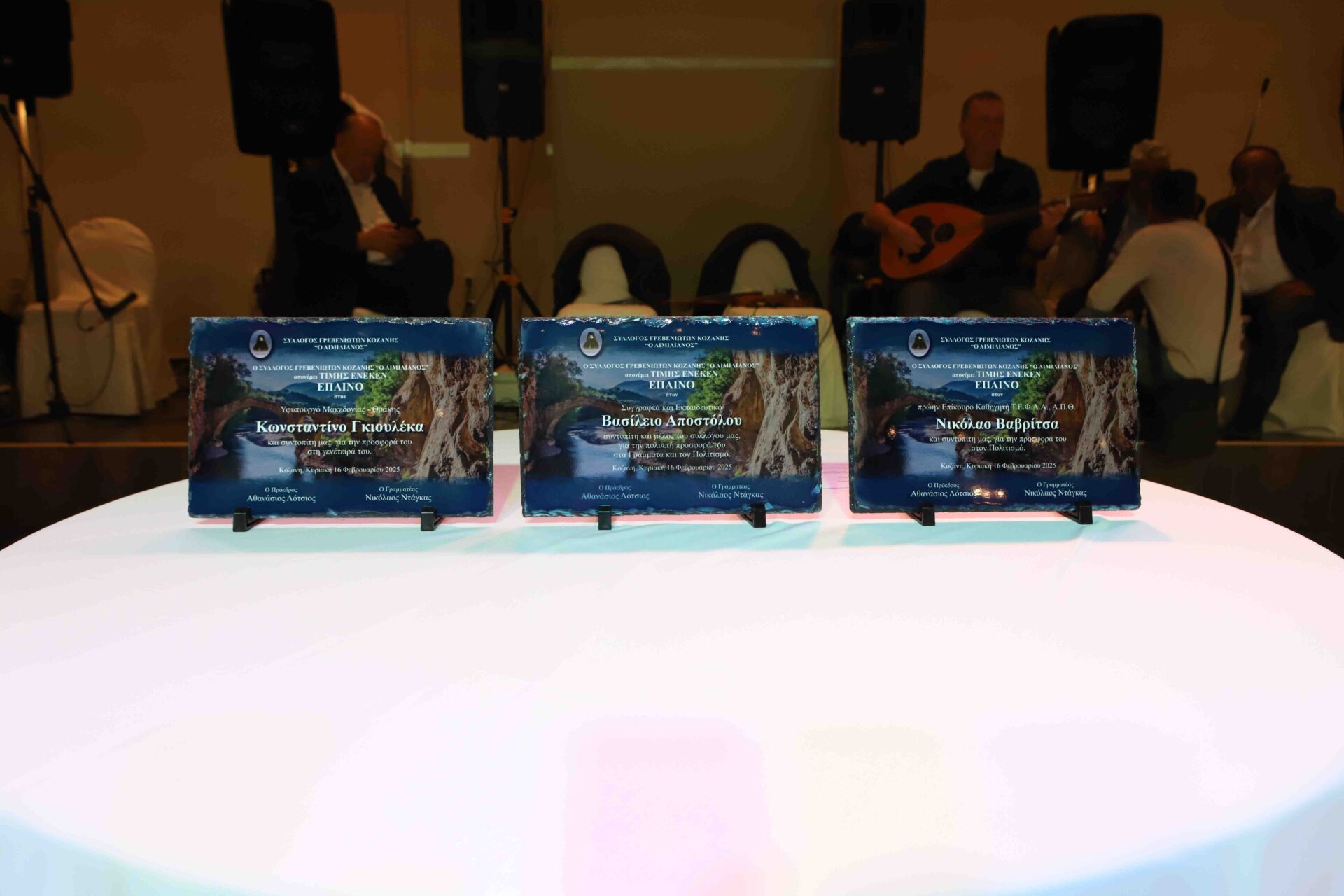 Η εκδήλωση ξεκίνησε με την βράβευση επιτυχόντων φοιτητών στις πανελλαδικές εξετάσεις 2024 στην Τριτοβάθμια Εκπαίδευσης, γρεβενιώτικης καταγωγής που μένουν στο νομό Κοζάνης. Στη συνέχεια τιμήθηκαν τρεις επιφανείς πολίτες με καταγωγή από το νομό Γρεβενών: Ο ΓΚΙΟΥΛΕΚΑΣ ΚΩΝΤΑΝΤΙΝΟΣ (υφυπουργός Μακεδονίας και Θράκης), ο ΒΑΒΡΙΤΣΑΣ ΝΙΚΟΛΑΟΣ (συνταξιούχος πανεπιστημιακός) για τη συνεισφορά του στο χώρο της εκπαίδευσης και της μουσικοχορευτικής παράδοσης, και ο ΑΠΟΣΤΟΛΟΥ ΒΑΣΙΛΕΙΟΣ (συνταξιούχος εκπαιδευτικός) συγγραφέας 15 βιβλίων με την τοπική ιστορία Γρεβενών-Κοζάνης.