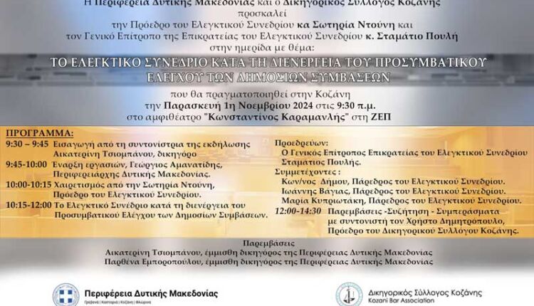 Ημερίδα με θέμα «Το ελεγκτικό συνέδριο κατά τη διενέργεια του προσυμβατικού ελέγχου των δημοσίων συμβάσεων» θα πραγματοποιηθεί την Παρασκευή 1 Νοεμβρίου 2024 στις 9:30 π.μ. στο αμφιθέατρο «Κωνσταντίνος Καραμανλής στο κτίριο της Περιφέρειας Δυτικής Μακεδονίας στη ΖΕΠ Κοζάνης.
