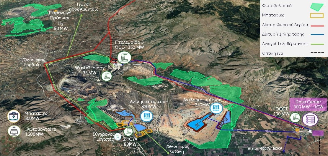 Στο μεγαλεπήβολο πλάνο παρουσιάσθηκαν επενδύσεις 1,2 δισ. € για κατασκευή φωτοβολταϊκών στις περιοχές των ορυχείων (συνολικά 2.130MW) και 940 εκατ. € για έργα αποθήκευσης ενέργειας (860 MW). Επίσης δύο αντλησιοταμιευτικά έργα, «φυσικές μπαταρίες» με τη χρήση δύο λιμνών σε υψομετρική διαφορά μεταξύ τους (η πρώτη 430 εκ. € στο ορυχείο Καρδιάς -320MW, 8ωρών και η δεύτερη 310 εκ. € στο ορυχείο Νοτίου Πεδίου -240 MW, 12 ωρών).