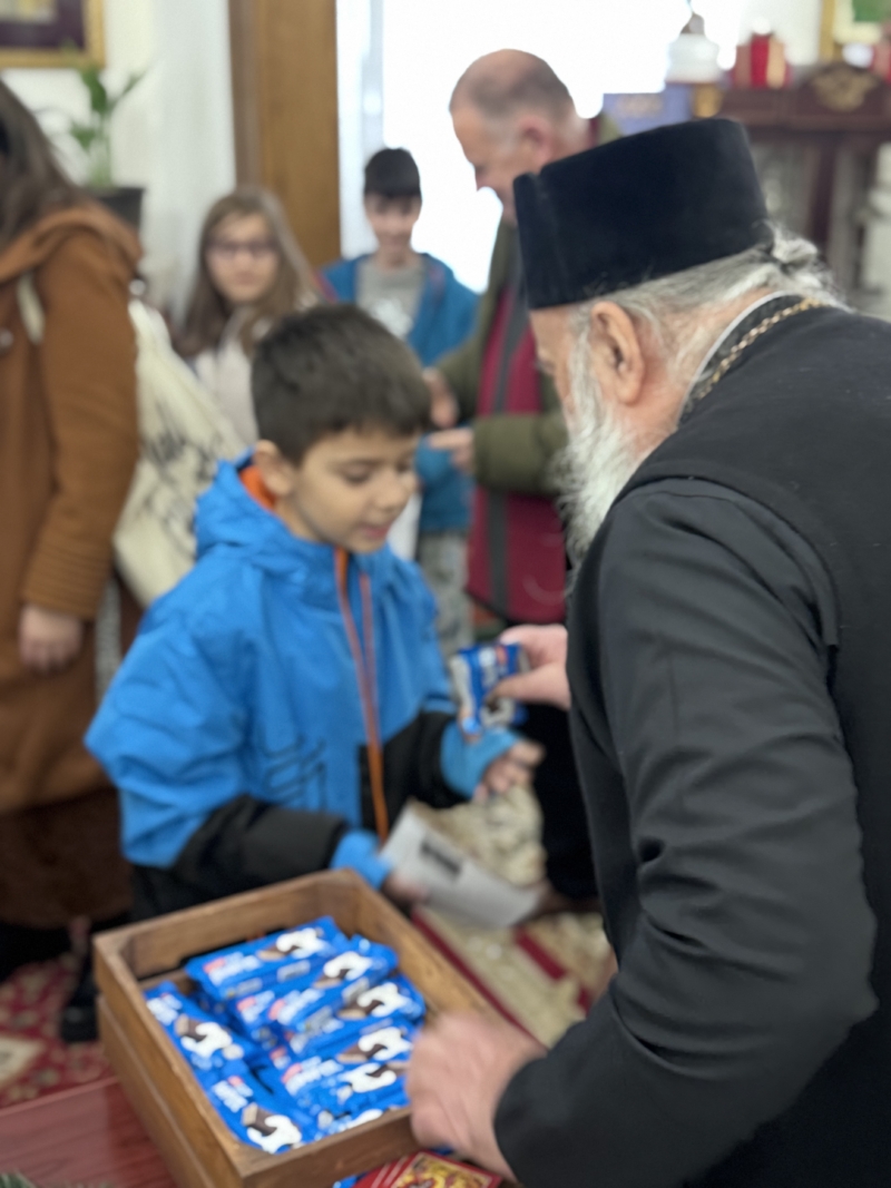 Ο Σεβασμιώτατος, με την απλότητα και τη ζεστασιά που τον διακρίνει, συμμετείχε στη χαρά των παιδιών χτυπώντας ρυθμικά την παραδοσιακή τζομπανίκα, δίνοντας έναν ιδιαίτερο τόνο στην όμορφη αυτή στιγμή. Στη συνέχεια, εξήγησε στους μαθητές τη χρήση της, αναφέροντας ότι παλαιότερα τα παιδιά τη χρησιμοποιούσαν όταν γύριζαν από σπίτι σε σπίτι για τα κάλαντα, χτυπώντας με αυτήν την πόρτα κάθε νοικοκυράς αντί για κουδούνι.