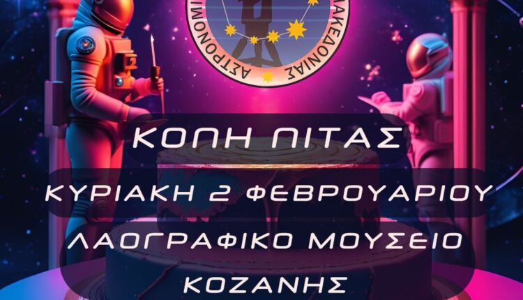 Ο Αστρονομικός Σύλλογος Δυτικής Μακεδονίας σας προσκαλεί στην ετήσια εκδήλωση για την κοπή της πρωτοχρονιάτικης πίτας, που θα πραγματοποιηθεί την Κυριακή 2 Φεβρουαρίου στις 19:00, στο Λαογραφικό Μουσείο Κοζάνης.