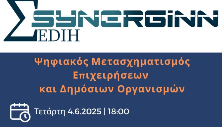 O Κόμβος SYNERGiNN, ως μέλος του Δικτύου των Ευρωπαϊκών Κόμβων Ψηφιακής Καινοτομίας, βοηθά τις μικρομεσαίες επιχειρήσεις και τους Δημόσιους Οργανισμούς να αναβαθμίσουν τη ψηφιακή τους ωριμότητα.