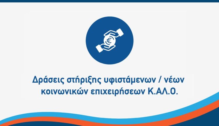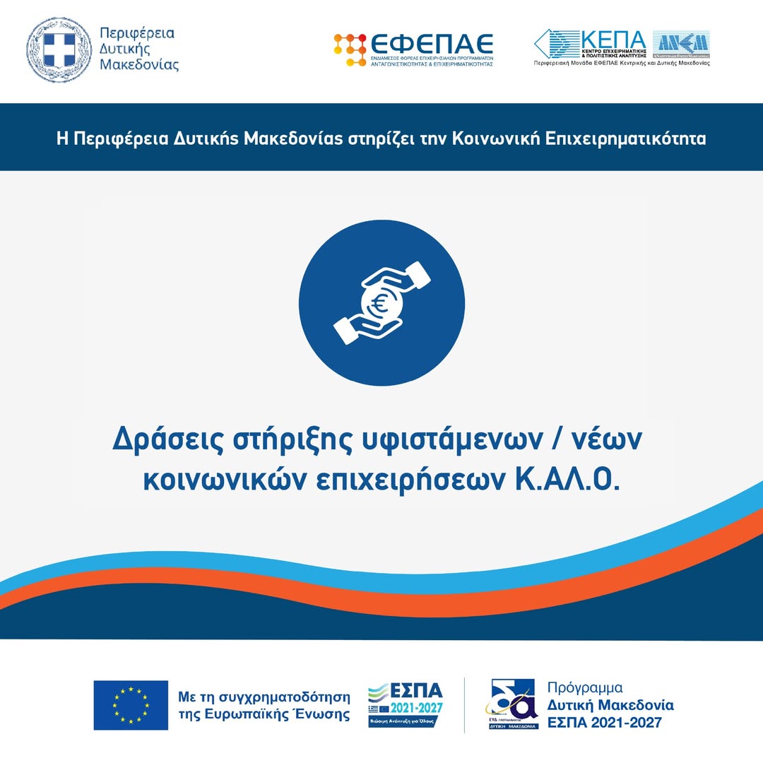 H Περιφέρεια Δυτικής Μακεδονίας και η Ειδική Υπηρεσία Διαχείρισης του Προγράμματος «Δυτική Μακεδονία» 2021-2027, σε συνεργασία με την ΚΕΠΑ-ΑΝΕΜ ΑΜΚΕ, αρμόδιο Εταίρο-Περιφερειακή Μονάδα του Ενδιάμεσου Φορέα του Προγράμματος «Δυτική Μακεδονία» 2021-2027-ΕΦΕΠΑΕ ανακοινώνουν ότι απο τις 14 Ιανουαρίου 2026 και ώρα 13:00 ενεργοποιήθηκε η πλατφόρμα ηλεκτρονικής υποβολής αιτήσεων χρηματοδότησης στο Ολοκληρωμένο Πληροφοριακό Σύστημα Κρατικών Ενισχύσεων (OΠΣΚΕ) στη νέα δράση του ΕΣΠΑ 2021-2027: «Δράσεις στήριξης υφιστάμενων / νέων κοινωνικών επιχειρήσεων Κ.Αλ.Ο.» του Προγράμματος «Δυτική Μακεδονία 2021-2027».