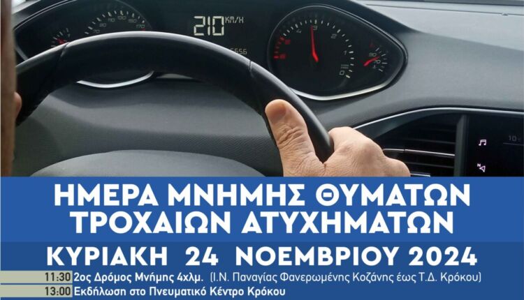 Το Τμήμα Τροχαίας Κοζάνης της Διεύθυνσης Αστυνομίας Κοζάνης, με αφορμή την «Παγκόσμια Ημέρα Μνήμης για τα Θύματα Τροχαίων Ατυχημάτων», συνδιοργανώνει με την τοπική διοίκηση Κοζάνης της Διεθνούς Ένωσης Αστυνομικών Υπαλλήλων (I.P.A.), τον 2ο Δρόμο Μνήμης -4- χιλιομέτρων τιμώντας τη μνήμη όσων έχασαν την ζωή τους από Τροχαία Δυστυχήματα, ενώ θα ακολουθήσει εκδήλωση στην αίθουσα εκδηλώσεων «Ιωακείμ Λιούλια» του πνευματικού Κέντρου Κρόκου Κοζάνης, με τίτλο «Κόψε ταχύτητα….. όχι το νήμα της ζωής σου».