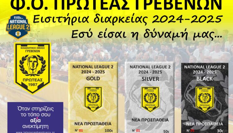 Η Διοίκηση του Φ.Ο.ΠΡΩΤΕΑΣ ΓΡΕΒΕΝΩΝ ενημερώνει τους φίλους του συλλόγου, ότι ξεκίνησε η διάθεση των εισιτηρίων διαρκείας για την νέα αγωνιστική χρονιά 2024 – 2025.