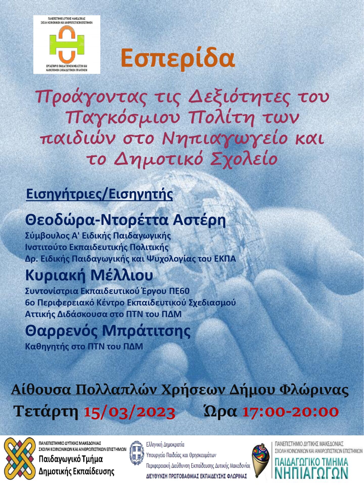 Πανεπιστήμιο Δυτικής Μακεδονίας | Εσπερίδα με θέμα «Προάγοντας τις Δεξιότητες του Παγκόσμιου Πολίτη των παιδιών στο Νηπιαγωγείο και το Δημοτικό Σχολείο», στη Φλώρινα