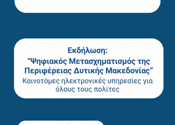 Η Περιφέρεια Δυτικής Μακεδονίας διοργανώνει δύο ενημερωτικές εκδηλώσεις για την παρουσίαση του έργου «Ψηφιακός Μετασχηματισμός με χρήση εφαρμογών Ηλεκτρονικής Διακυβέρνησης», το οποίο έχει ενταχθεί στο Πρόγραμμα «Δυτική Μακεδονία 2021-2027» και συμβάλλει καθοριστικά στον εκσυγχρονισμό των υπηρεσιών και στη βελτίωση της καθημερινής εξυπηρέτησης των πολιτών. Στόχος των ημερίδων είναι η αναλυτική ενημέρωση για τις νέες ψηφιακές δυνατότητες που εισάγει το έργο, καθώς και η παρουσίαση των τεχνολογικών και λειτουργικών αλλαγών που αναβαθμίζουν τη σχέση πολίτη – διοίκησης.