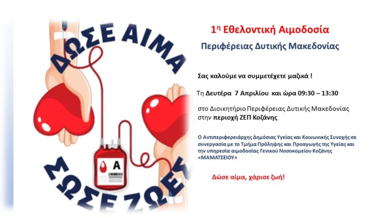 Τη Δευτέρα 7 Απριλίου και ώρα 09:30 – 13:30, θα πραγματοποιηθεί ανοιχτή εθελοντική αιμοδοσία, στο Διοικητήριο Περιφέρειας Δυτικής Μακεδονίας στην περιοχή ΖΕΠ Κοζάνης, με κινητό συνεργείο από την υπηρεσία αιμοδοσίας του «ΜΑΜΑΤΣΕΙΟΥ» Γενικού Νοσοκομείου Κοζάνης.