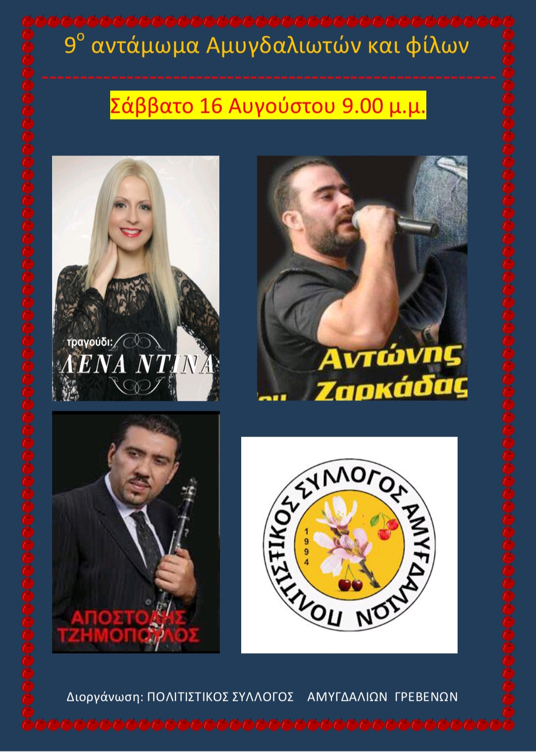- Το Σάββατο 16 Αυγούστου το βράδυ διοργανώνει το 9ο αντάμωμα Αμυγδαλιωτών και Φίλων με το συγκρότημα του Αποστόλη Τζιμόπουλου και στο τραγούδι την Λένα Ντίνα και τον Αντώνη Ζαρκάδα. Ένα παραδοσιακό Γρεβενιώτικο γλέντι με φαγητό και ποτό σε πολύ καλή τιμή και είσοδο ελεύθερηγια όλους. Στην εκδήλωση θα τιμηθούν για την μεγάλη προσφορά τους στο Σύλλογο τα μέλη του χορευτικού που έφυγαν από την ζωή Σταυρούλα Ζεμπίλη, Χαρίκλεια Κουταλή, Κλεάνθη Καραμήτρου, Μακεδονία Γ. Καραλιόλιου, καθώς και τα μέλη που αποχώρησαν για λόγους ηλικίας ή υγείας Ιφιγένεια Παπαλιούρα, Μαρίκα Τσούπα, Κατερίνα Καραμήτρου, Αναστασία Παλαιοχωρίτη, Μερόπη Λιάκα, Χριστίνα Δήλμα, Χρυσάνθη Ρότσικα, Κατερίνα Σίνη, Ελευθερία Σκάκα, Ροδιάνθη Μπουρέλλα, Αιμιλία Γκίλια, Παναγιώτα Κ. Κιούρκα, Παναγιώτα Ε. Κιούρκα, Αγγελική Δόγκα, Μαρία Δροβατζήκα, Μαριάνθη Κιούρκα, Ευαγγελία Λιάκα.