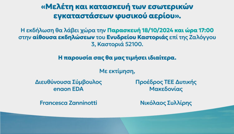 Η Ελληνική Εταιρεία Διανομής Enaon EDA, θυγατρική της Enaon και το Τεχνικό Επιμελητήριο της Ελλάδος Τμήμα Δυτικής Μακεδονίας με χαρά σας προσκαλούν στην εκπαιδευτική ημερίδα που συνδιοργανώνουν με θέμα: “Μελέτη και κατασκευή εσωτερικών εγκαταστάσεων φυσικού αερίου”.
