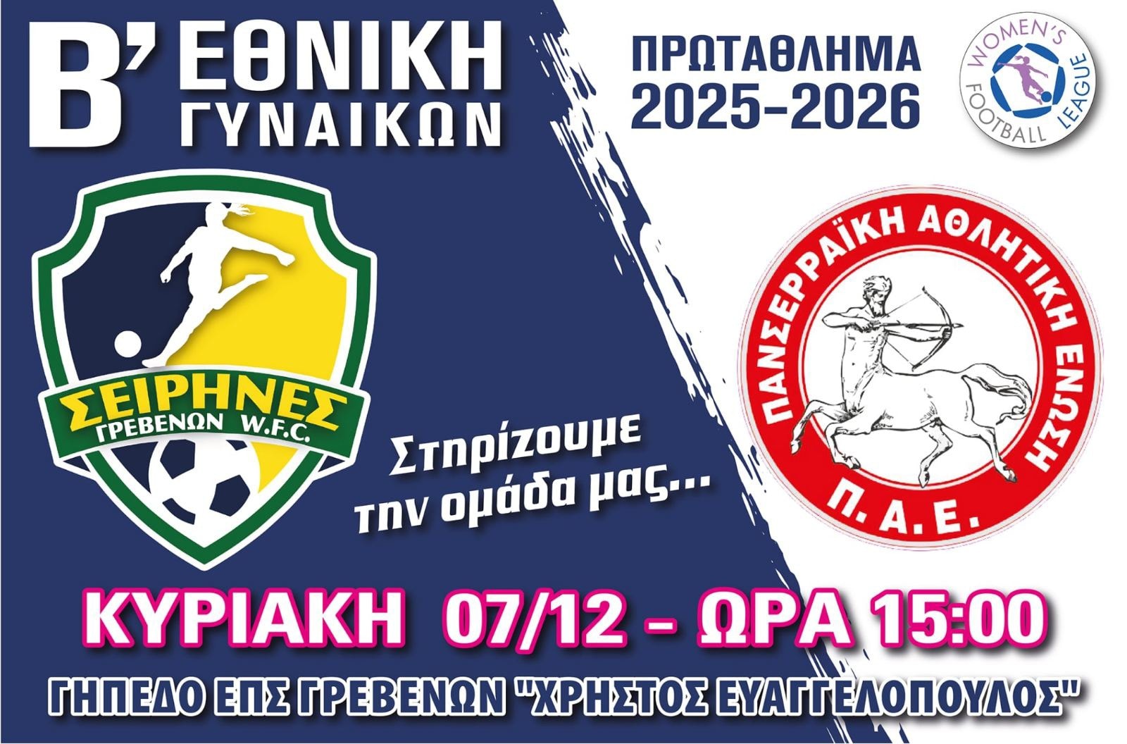 Ο Α.Σ. Σειρήνες Γρεβενών ανακοινώνει ότι την Κυριακή 7 Δεκεμβρίου, στις 15:00, στο Δημοτικό Γήπεδο Γρεβενών, η γυναικεία ομάδα ποδοσφαίρου θα αντιμετωπίσει τον Πανσερραϊκό στο πλαίσιο της επόμενης αγωνιστικής.