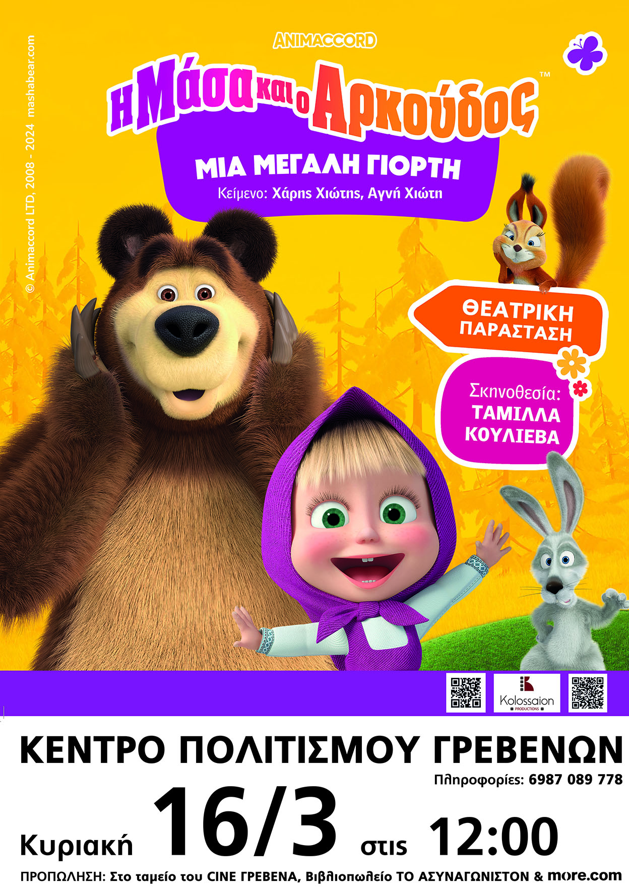 Η επίσημη θεατρική παράσταση «Η Μάσα και ο Αρκούδος, μια μεγάλη γιορτή» σε σκηνοθεσία Ταμίλλα Κουλίεβα, θα βρίσκεται για μία μοναδική παράσταση στα Γρεβενά στο Κέντρο Πολιτισμού Γρεβενών την Κυριακή 16 Μαρτίου 2025 στις 12:00
