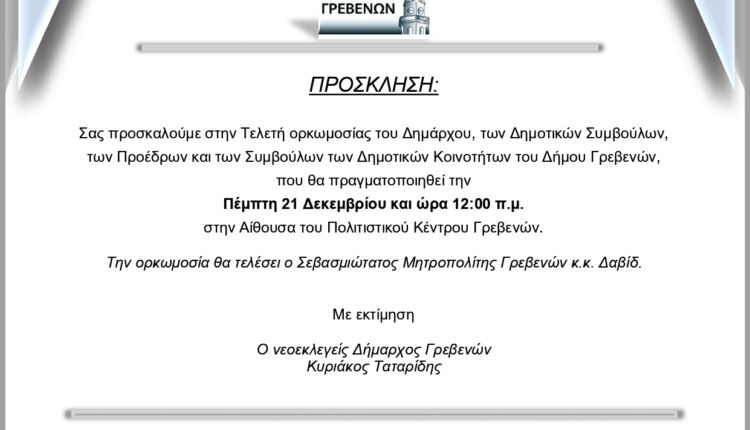 Την προσεχή Πέμπτη 21 Δεκεμβρίου, στις 12:00 το μεσημέρι, στην Αίθουσα του Κέντρου Πολιτισμού του Δήμου Γρεβενών, θα πραγματοποιηθεί η Τελετή Ορκωμοσίας του νεοεκλεγέντος Δημάρχου, Κυριάκου Ταταρίδη, του νέου Δημοτικού Συμβουλίου του Δήμου Γρεβενών και των Προέδρων και μελών των Συμβουλίων των Κοινοτήτων.