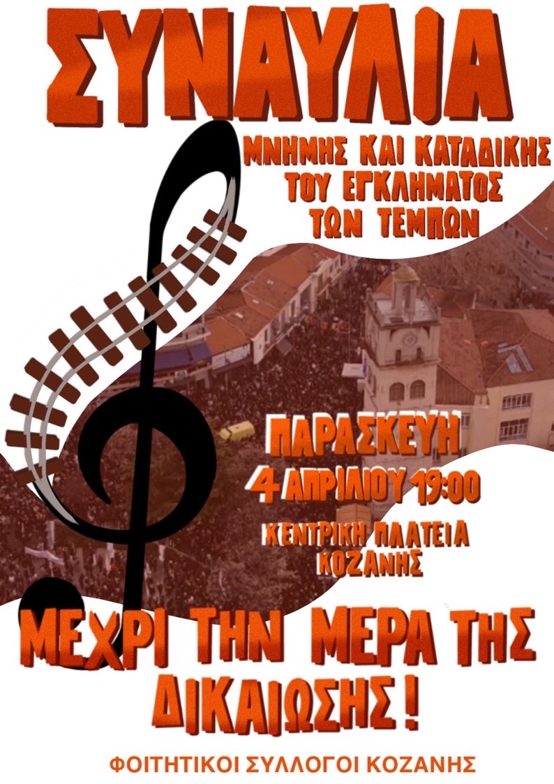 Οι Φοιτητικοί Σύλλογοι των, Χημικών Μηχανικών, Ηλεκτρολόγων Μηχανικών και Μηχανικών Σχεδίασης Προϊόντων και Συστημάτων του Πανεπιστημίου Δυτικής Μακεδονίας, διοργανώνουν μεγάλη συναυλία αφιερωμένη στο έγκλημα των Τεμπών, την Παρασκευή 4 Απρίλη, στις 19:00 στην Κεντρική Πλατεία της Κοζάνης.