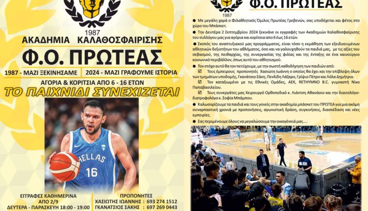 Τη Δευτέρα 2 Σεπτεμβρίου 2024 αρχίζουν οι εγγραφές των Ακαδημιών Μπάσκετ του Φ.Ο. Πρωτέας Γρεβενών, για αγόρια και κορίτσια από 6 έως 16 ετών, για τη νέα αθλητική χρονιά.