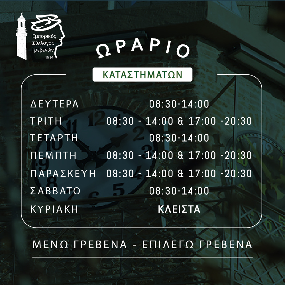 Ο Εμπορικός Σύλλογος Γρεβενών ανακοινώνει το χειμερινό ωράριο καταστημάτων που θα ισχύει από 1 Νοεμβρίου 2023 έως 30Μαρτίου 2024. Η λειτουργία των καταστημάτων στα Γρεβενά κατά την φετινή χειμερινή περίοδο θα πραγματοποιηθεί σύμφωνα με το ακόλουθο πρόγραμμα: