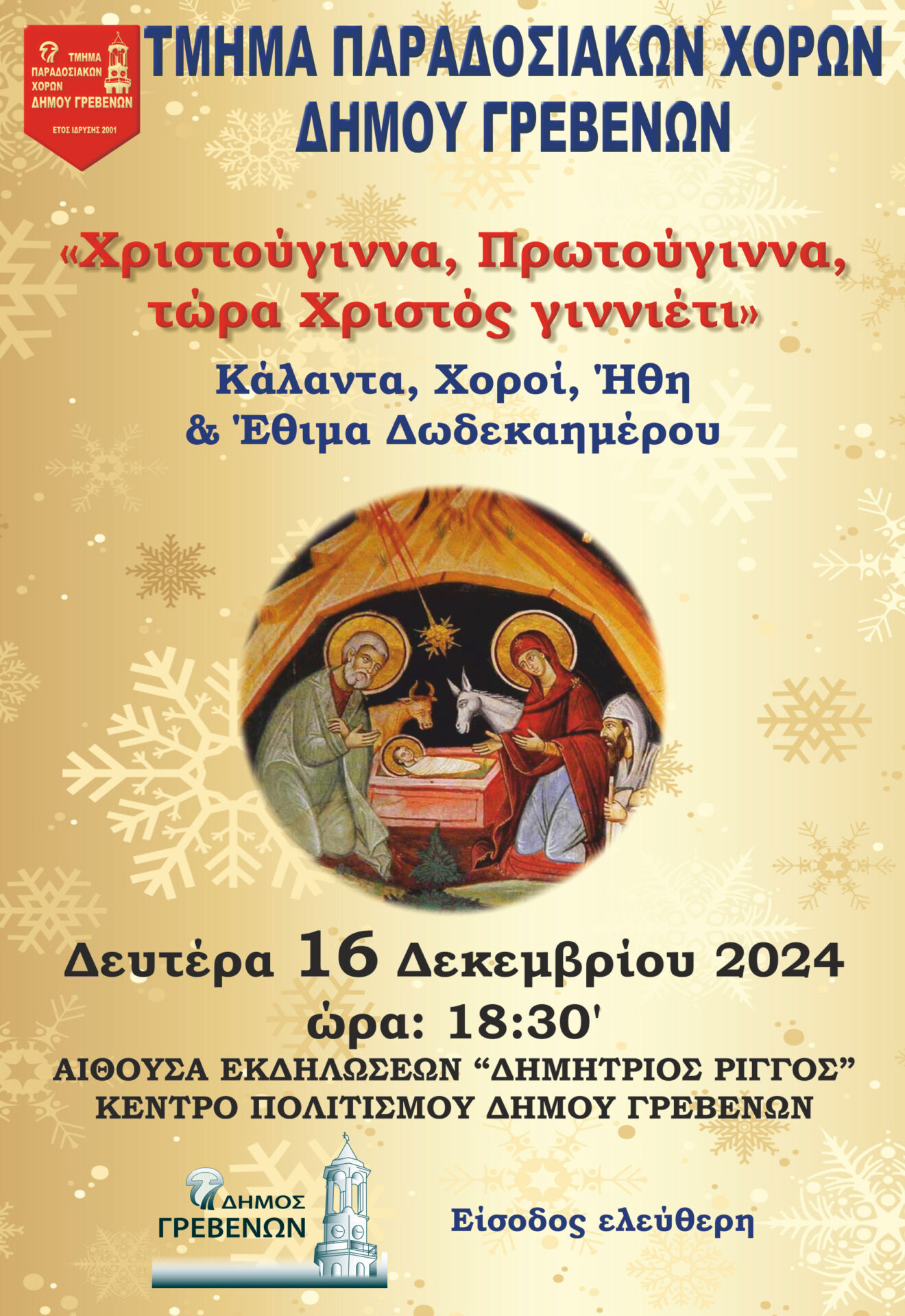 Ο Δήμος Γρεβενών σας προσκαλεί στη Χριστουγεννιάτικη χορευτική εκδήλωση του Τμήματος Παραδοσιακών Χορών με κεντρικό τίτλο «Χριστούγιννα, Πρωτούγιννα, τώρα Χριστός γιννιέτι», αφιερωμένη στα κάλαντα, τους χορούς, τα ήθη και έθιμα του Δωδεκαημέρου, η οποία θα πραγματοποιηθεί την Δευτέρα 16 Δεκεμβρίου 2024 και ώρα 18:30 στην Αίθουσα Εκδηλώσεων “Δημήτριος Ρίγγος” του Κέντρου Πολιτισμού του Δήμου Γρεβενών, με ελεύθερη είσοδο για το κοινό.