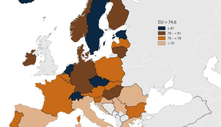 Τα χαμηλότερα ποσοστά καταγράφηκαν στην Ιταλία (65%), την Ελλάδα (66%) και τη Ρουμανία (69%).